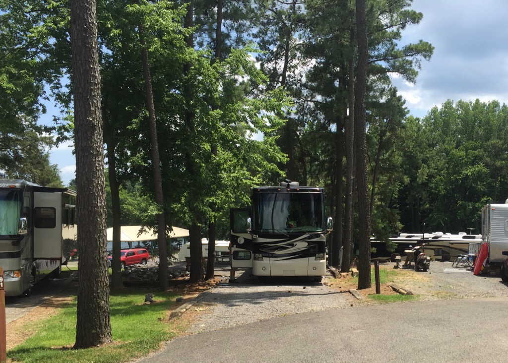 The site has a slight slope so we put plastic levelers under the rear wheels. We used to use them on the 5th wheel. The bus crushed them!