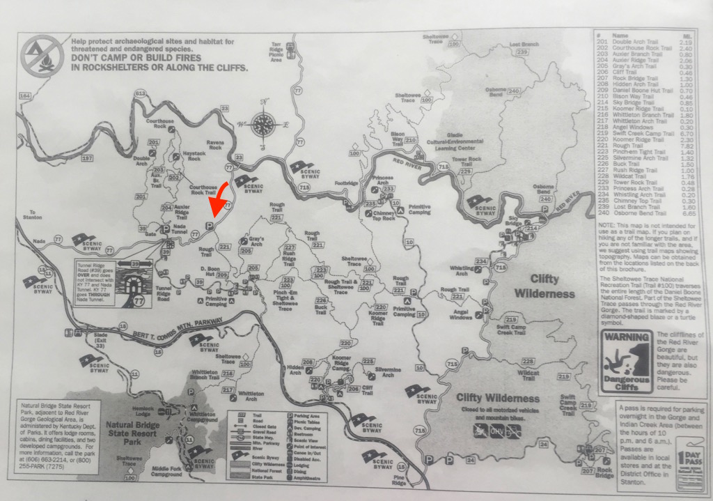 This was the only map we had to hike. The red arrow shows the Trailhead parking and you can see, no trail from here, but we saw the trail we wanted to be on….