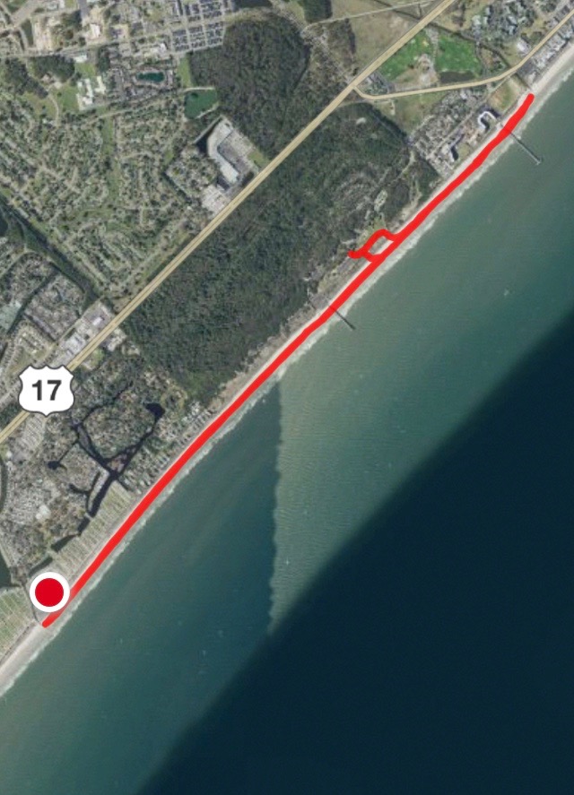 This is a screen shot of our five mile walk, 2 1/2 out and back. It’s not the best picture, but the best I could get. If you look closely, you will see two piers: Myrtle Beach State Park is first, then the Springmaid Pier is near the end of our walk.