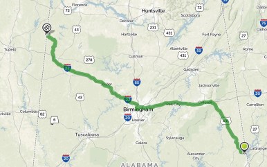 Our route from Amity Campground, Lanett, Alabama on the Georgia border, to Red Bay, Alabama. Just about 250 miles, taking less than five hours drive time.