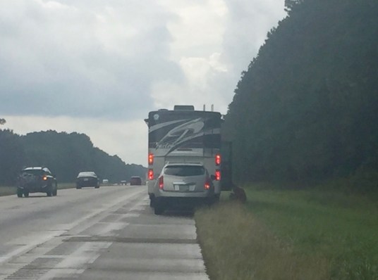 Alongside I-95 just past Dillon, SC. Bill is on the phone with the Emergency Roadside Services, hunched down trying to read what size tires we have!