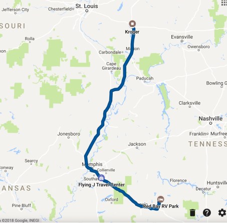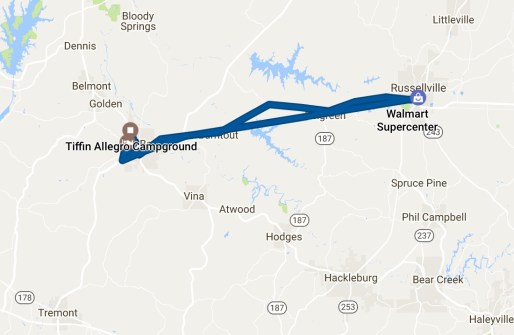 It was 178 miles from Foscue Creek Park to Red Bay. It took us nearly four hours because of traffic and going out of our way for fuel!
