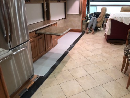 While they started pulling up the carpet up front, Bill and I were in the back, cleaning out all the stuff under our bed and shoving into the bathroom and shower stall. We had no idea we had so much stuff under it. I stepped out and they had pulled up the carpet on the slides. Sorry, not the best technician picture….