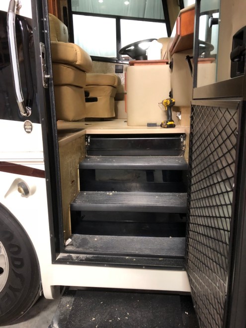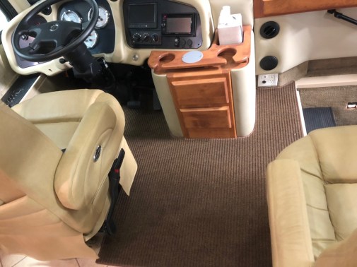 Bill was the driving force behind the new carpet. He has a better eye for beauty – I’m pretty much a vanilla and plain Jane type of person! It was easy to get me on board with the chairs once that was happening. It took seven hours to tear out and re-install the new carpet and the entrance floor mat. We could have had a few other things done during that time frame, but decided this was enough for now. On my dream list, heat in the passenger seat with lumbar support. Bill may as well. Here’s some pictures of the carpet install: