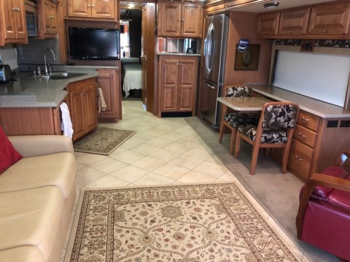 Our after picture of the chairs, valances and carpet on the slide. The carpet in the bedroom didn’t photograph very well. Sorry. Bill really wanted new tile as well – that was the one thing we really didn’t like when we bought it. Can you believe it would cost about $15,000 to have it replaced. Forget about it!