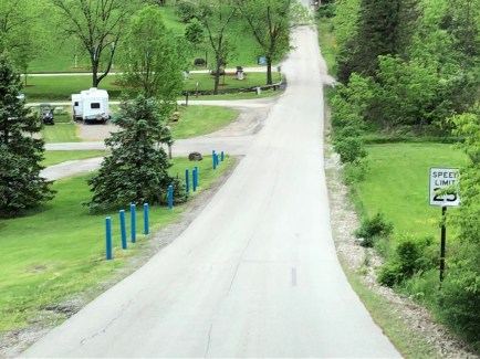 This was the little bridge we crossed over to park on this lower level. Do you see us? We are pretty much in the middle of this row. It was filling up for the Memorial Day Weekend, and full it did get. We are glad we booked this one ahead of time – which we do have to plan ahead for the summer holidays.
