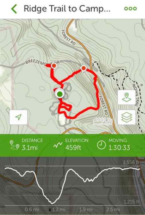 Camp Trail: 1.8-mile, difficult hiking. This steep trail begins at Ridge Camp Campground and ends at Breezemont Drive within view of the Log Cabin Inn Environmental Learning Center. This “calorie burning” trail is used by campers to travel from the campground to the Log Cabin Inn and main picnic area. Watch your map. Another section of Camp Trail ends farther up Breezemont Drive at the intersection of Corduroy Trail.