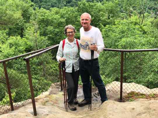 Here we are at Seneca Point. We wanted the background to show, but our random photographer thought we wanted to be the main attraction in this picture. From here is a view of the Clarion River Valley but we didn’t capture it. Let’s just go down the steep descent and see the river!