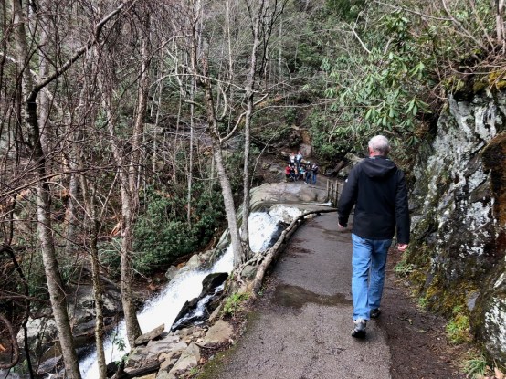 Laurel Falls Trail – up up up! We actually had to ask a Ranger for a recommendation for the hike, about 2 1/2 miles in distance. At first, we rejected this one because she said it was paved and rated easy. But at 5 pm, we didn’t have any other option. So up we went – with a small crowd! As it turned out, with the elevation, it wasn’t really all that easy. We’ve been walking on the flat beach since October – ok, truth be known, Bill is in REMARKABLE shape and I struggled to keep up with him. Oh how the tables have turned since we first started hiking in 2003….