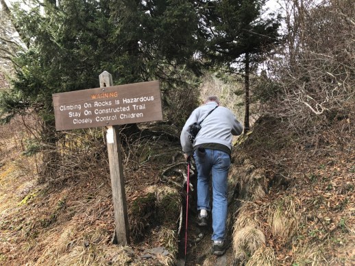 Our actual driving time from Myrtle Beach was six hours. Very doable – we knew we could get in a short hike upon arrival. Once we did arrive, Bill commented he was glad he was driving his car and not the motorhome! We stayed in a hotel rather than try to find a great deal in a cabin or condo – since our stay was only four days. Those deals are for at least a week. We had no idea we were blessed with a huge jacuzzi bathtub and a fire place in this hotel – an unadvertised feature! Off we went to the SMNP to get in a short hike. We stopped into the Sugarland Visitor Center to pick up a map to figure out the best hike to take. And then we met the Spring Break CROWD! The Visitor Center was packed as was the trailhead – which we had a bit of a problem finding it. Miraculously, once we arrived at the rather large trailhead parking area, we scored a parking space as someone else pulled out!