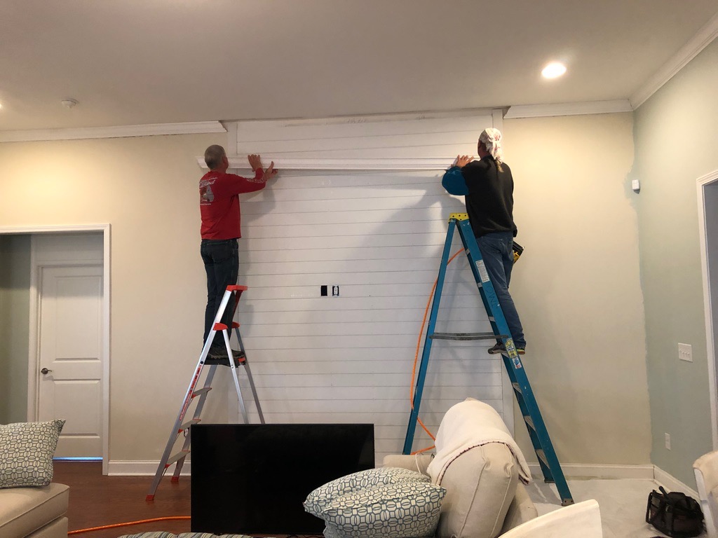 Bill’s first big project was to hang shiplap. He did it all by himself until the very end. He needed a pro to cut a few finger size slivers.