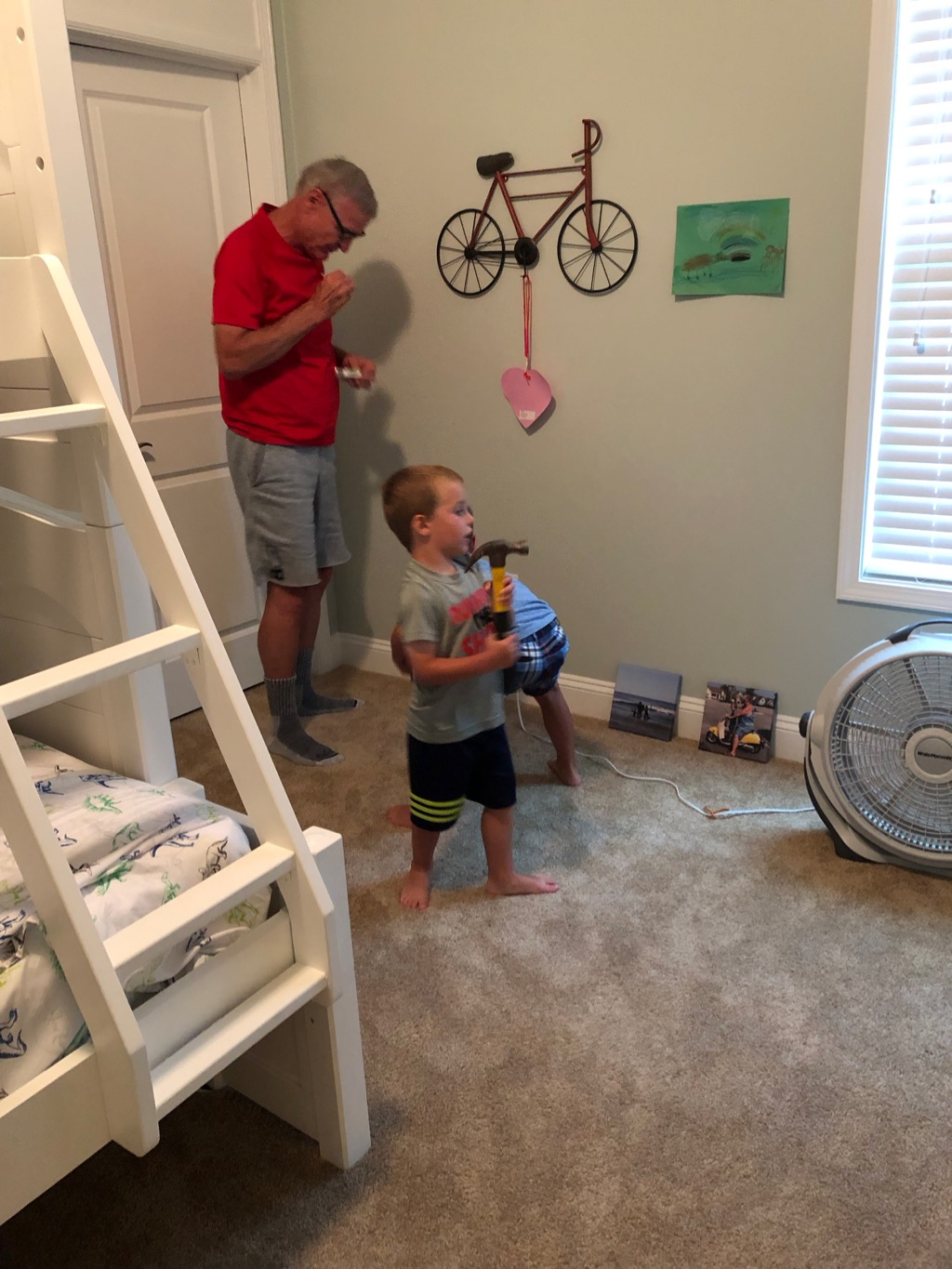 Our second guest room has a bunk bed set up, with a full size on the bottom. There, Bill hung more art work – here the boys are helping!