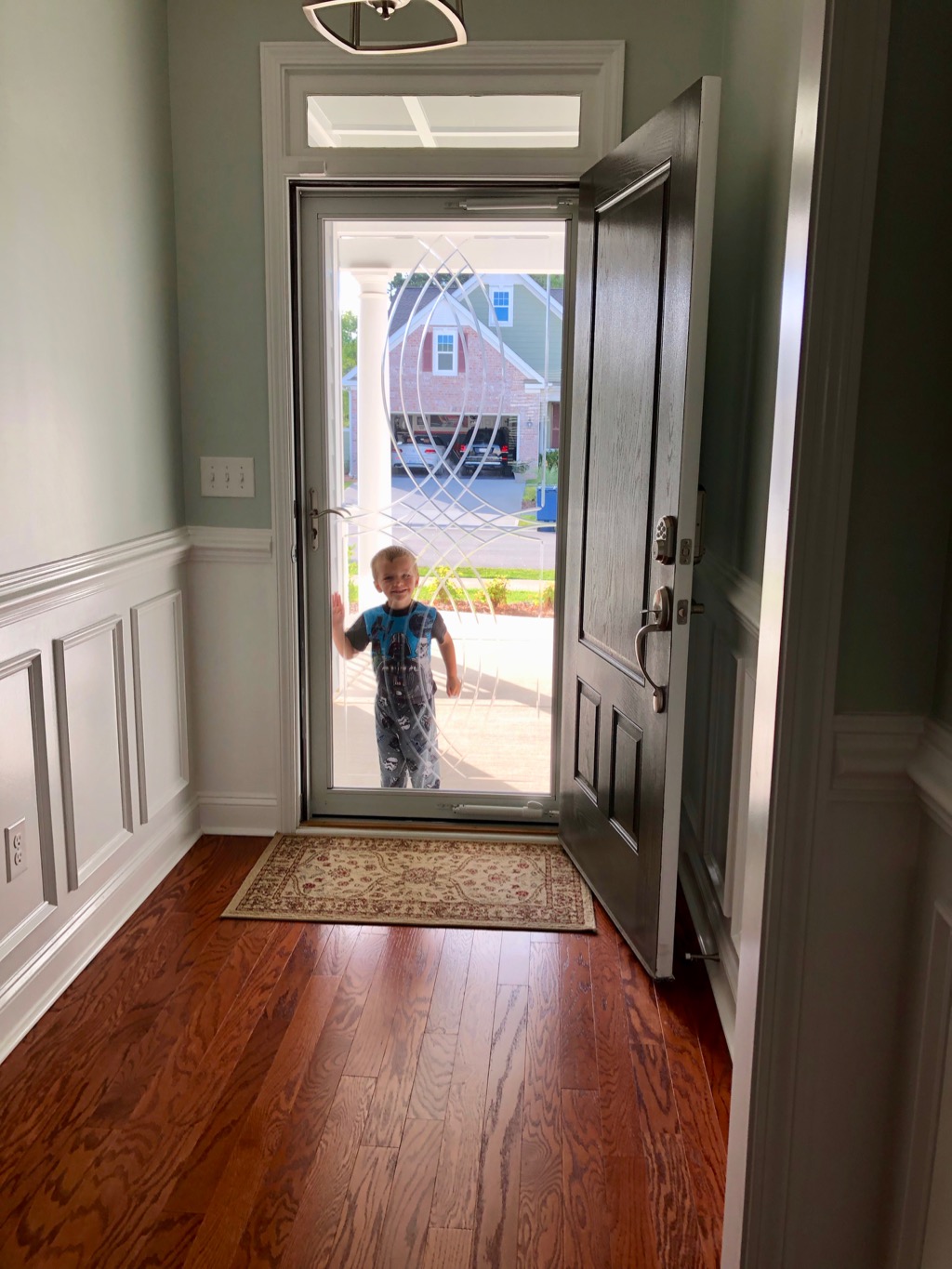 Our entrance hall. Bill added the chair rail and faux picture frame decor here and in the dining room. We need a hallway rug – still looking!
