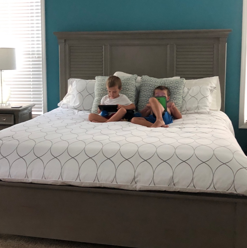 Our bed. Bill is actually on the floor doing his early morning stretches. We like to keep the boys calm while he exercises – so out come their tablets if they are too rambunctious!
