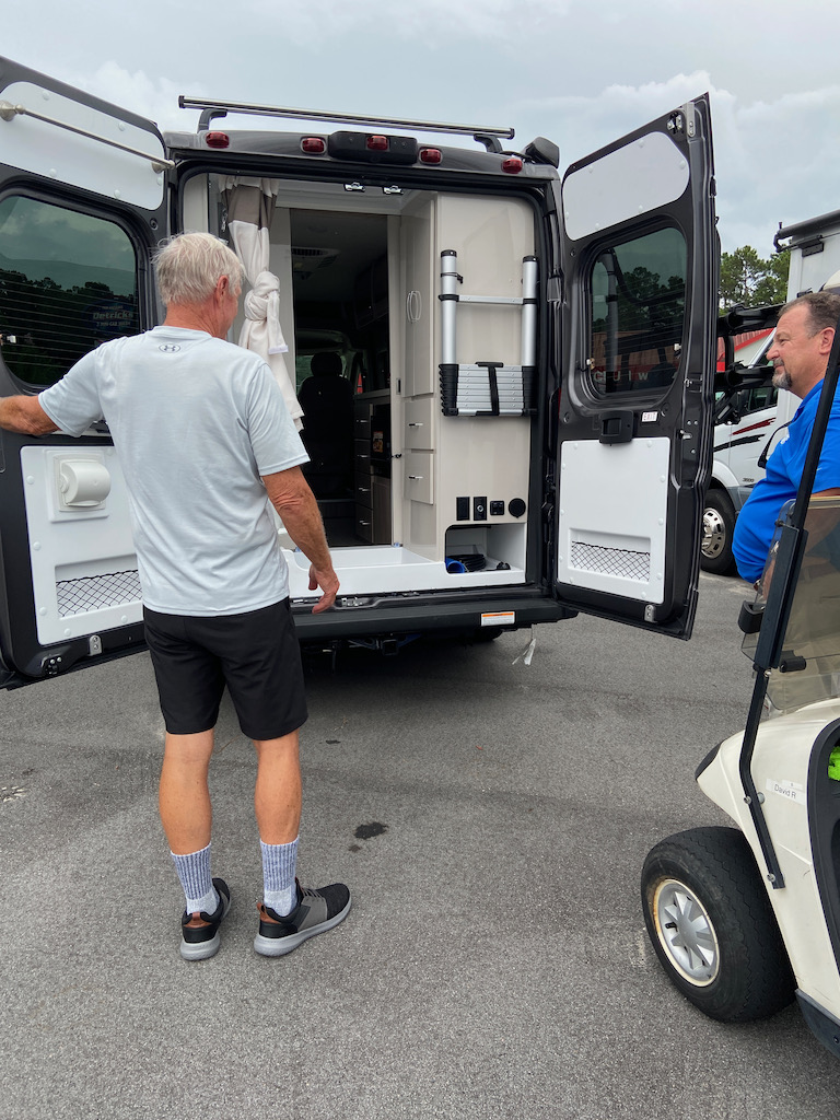Yesterday, it was overcast with possible thunderstorms brewing. It’s also a Saturday in Myrtle Beach – which means we don’t go to the beach (nor do we ever with storms brewing), nor visit any well traveled roads. We stay close to home. Interesting, there are two good sized RV dealerships near us. We decided to go see if we could get inside one to see if Bill would even fit. Other men 6’2″ and even a few taller, said they fit fine. Bill must be from Missouri as he said, “show me.” Below is a slide show of us looking at two dealerships and looking inside five or six (I didn’t take good notes):