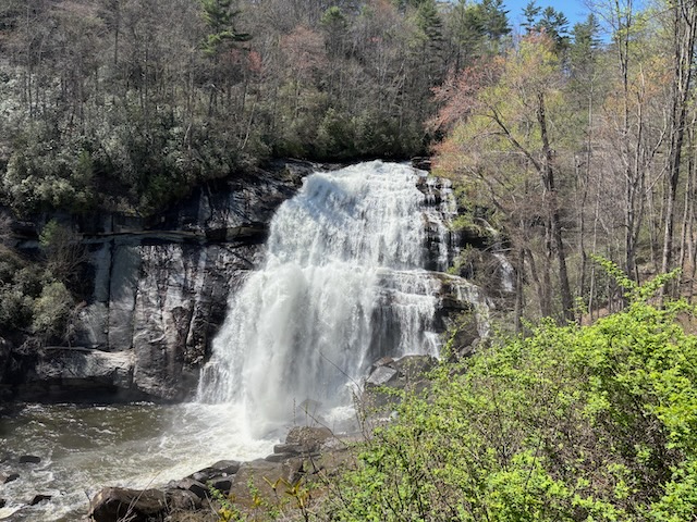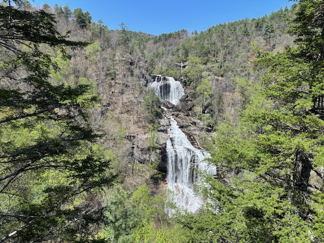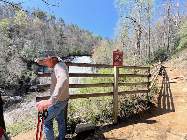 4/9/2025 Off to the main attraction that brought is here initially in 2019, Whitewater Falls. Bill read “Upper Whitewater Falls is not only the tallest waterfall in NC, but the highest waterfall east of the Rockies, though some may disagree with that title. Regardless of where you stand on that dispute, there is no denying the beauty of this massive 411-foot waterfall. Protected by Nantahala Forest, this waterfall is accessible by a short hike that leads to a viewing platform.” Our first time here, we not only did that short hike, we went on and on and on….via the Foothills Trail. Sadly, this hike was not saved in our All Trails app. But it says it is about 7.8 miles We may not have gone the entire route bit I know we did most of it. I never had to stop – then. This date, we did the shorter hike from the parking lot, to the observation tower, then down to the Foothills trail and back up to the parking lot. I never needed to rest but was ready to call it quits once we got back to the top – and parking lot! First is the view of the upper falls, from the parking lot. Then we walked down 1/10th of steps to the overlook. The young lady who took the picture asked if we wanted to show the falls….not sure why we didn’t take the hint! But I thought the view of the upper falls was sufficient!