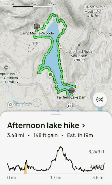 4/10/2025 Back to our faithful Fairfield Lake. Again, rain rain go away, come again another day! Another test of my endurance and it looks like I’m ready to tackle the Smoky’s!!! This photo below is from All Trails app that shows a bit of the topography of what became our favorite hike during rainy season!