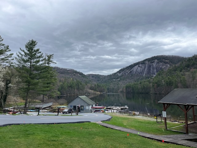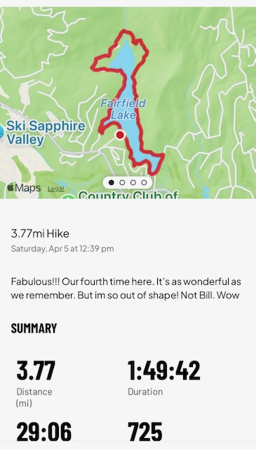 4/5/2025 Bill wisely said let’s just start with a relatively easy hike around Lake Fairfield. We also need to acclimate to higher elevation since we live at sea level! The lake is in a private community. Our condo has privileges to use the facilities. It has a bit of a rough terrain, slight elevation and was a good workout for me (Debbie). Bill had to slow down a few times for me to catch my breath. We made it 3.68 miles in an hour and 40 minutes. Off this path is a route up to the top of Little Bald Rock Mountain. We have asked others in the area if they have ever been to the top. No, until this day, FINALLY we met one. She’s a very fit young lady. She it’s about the same as the steep hike to the top of White Mountain. Bill had been feeling really fit, so I encouraged him to tackle it. Below is the Little Bald Rock Mountain in the background of where we park. Such a lovely walk/hike for nearly four miles around the lake.